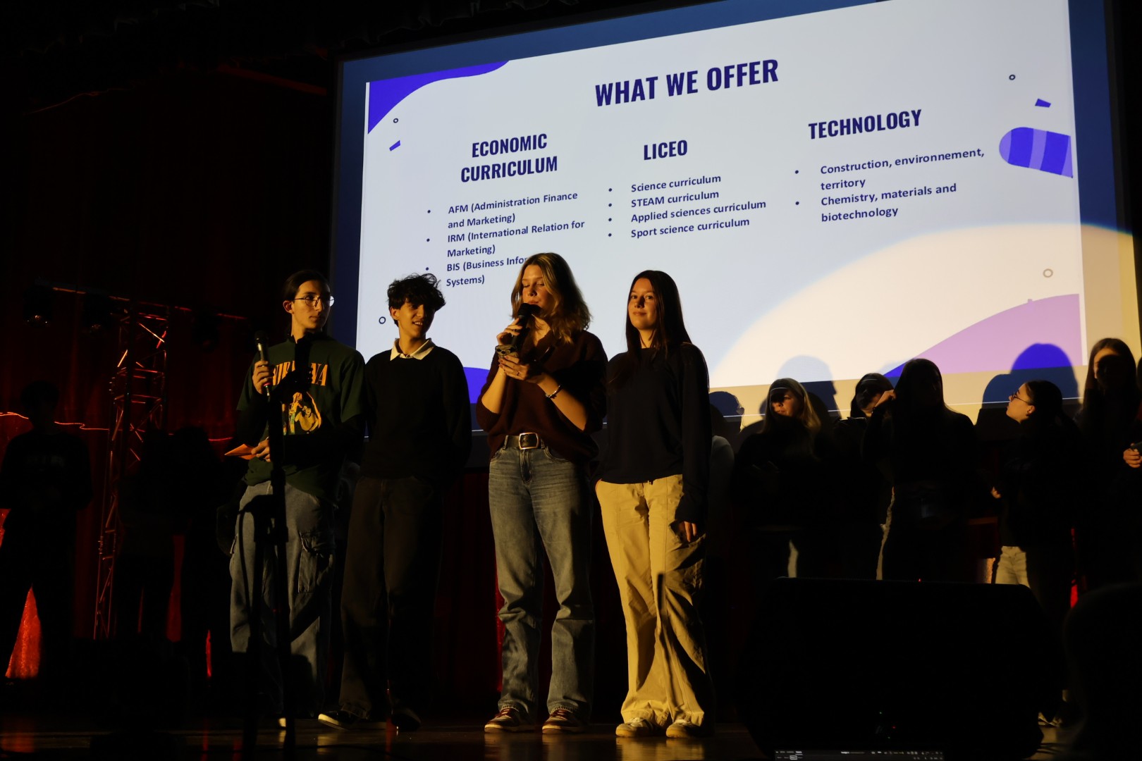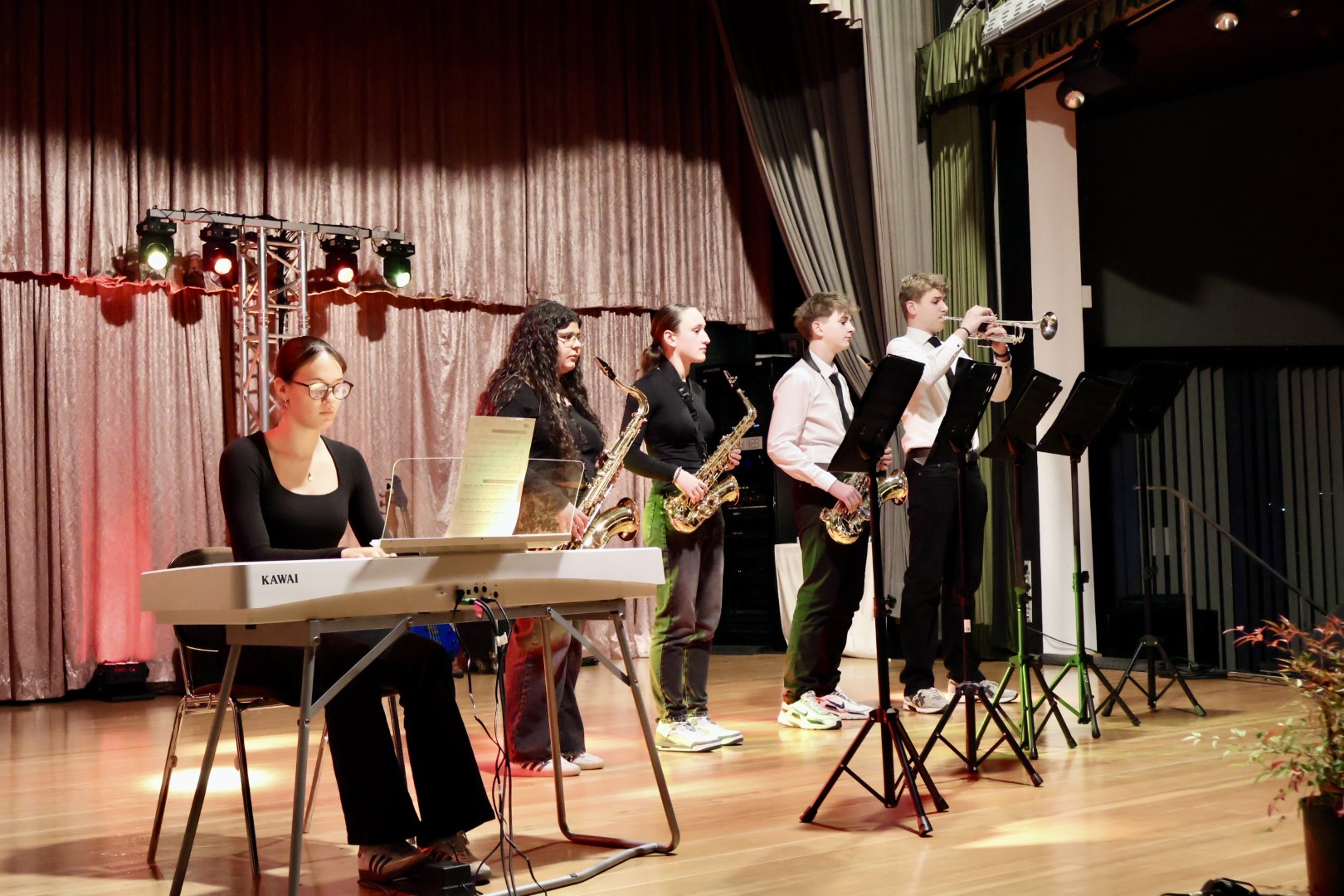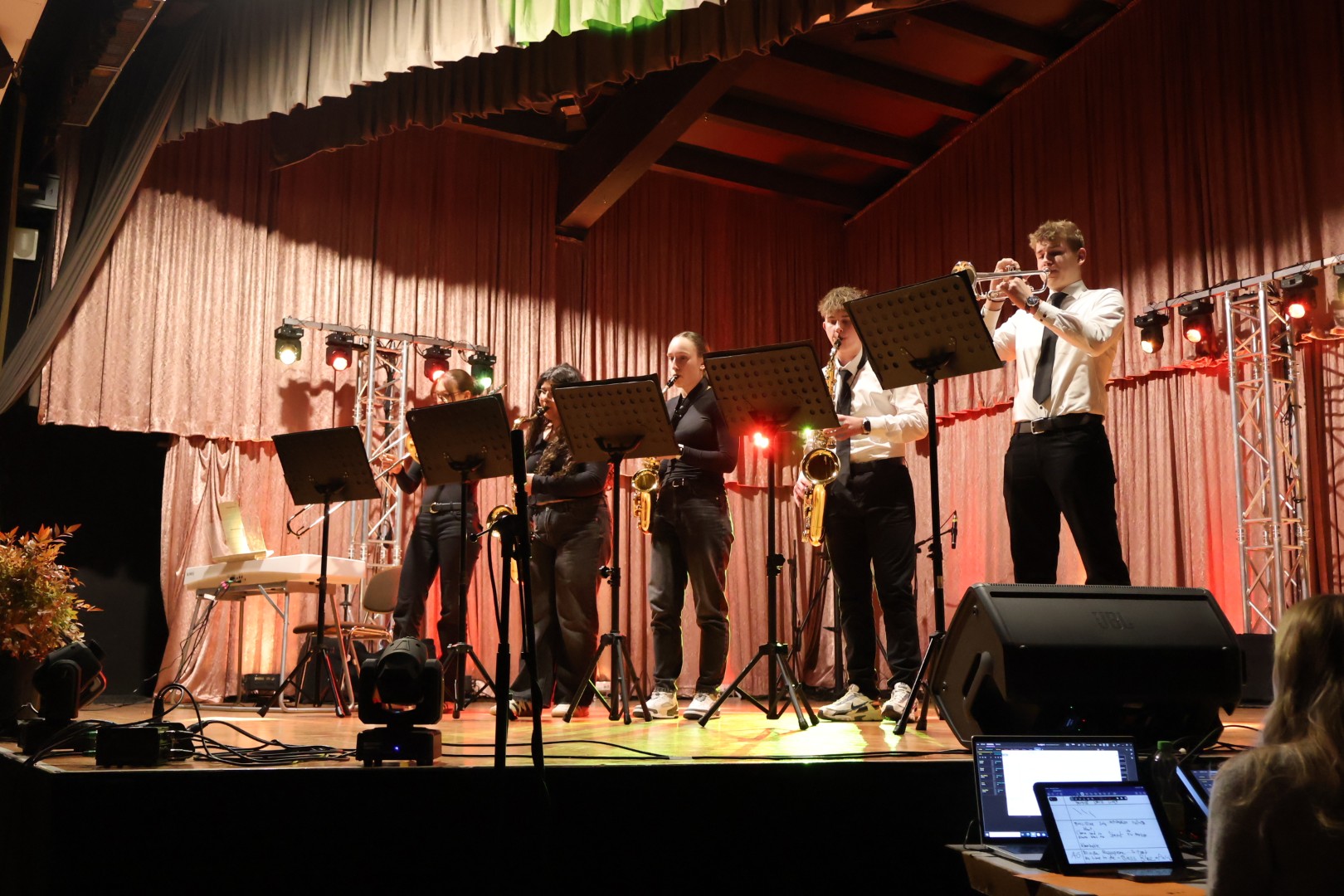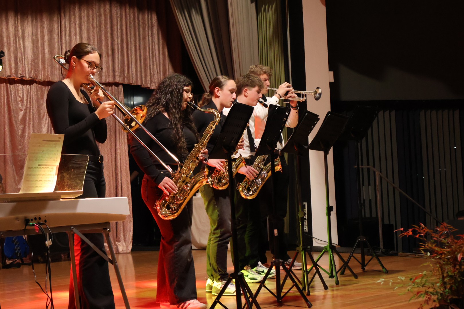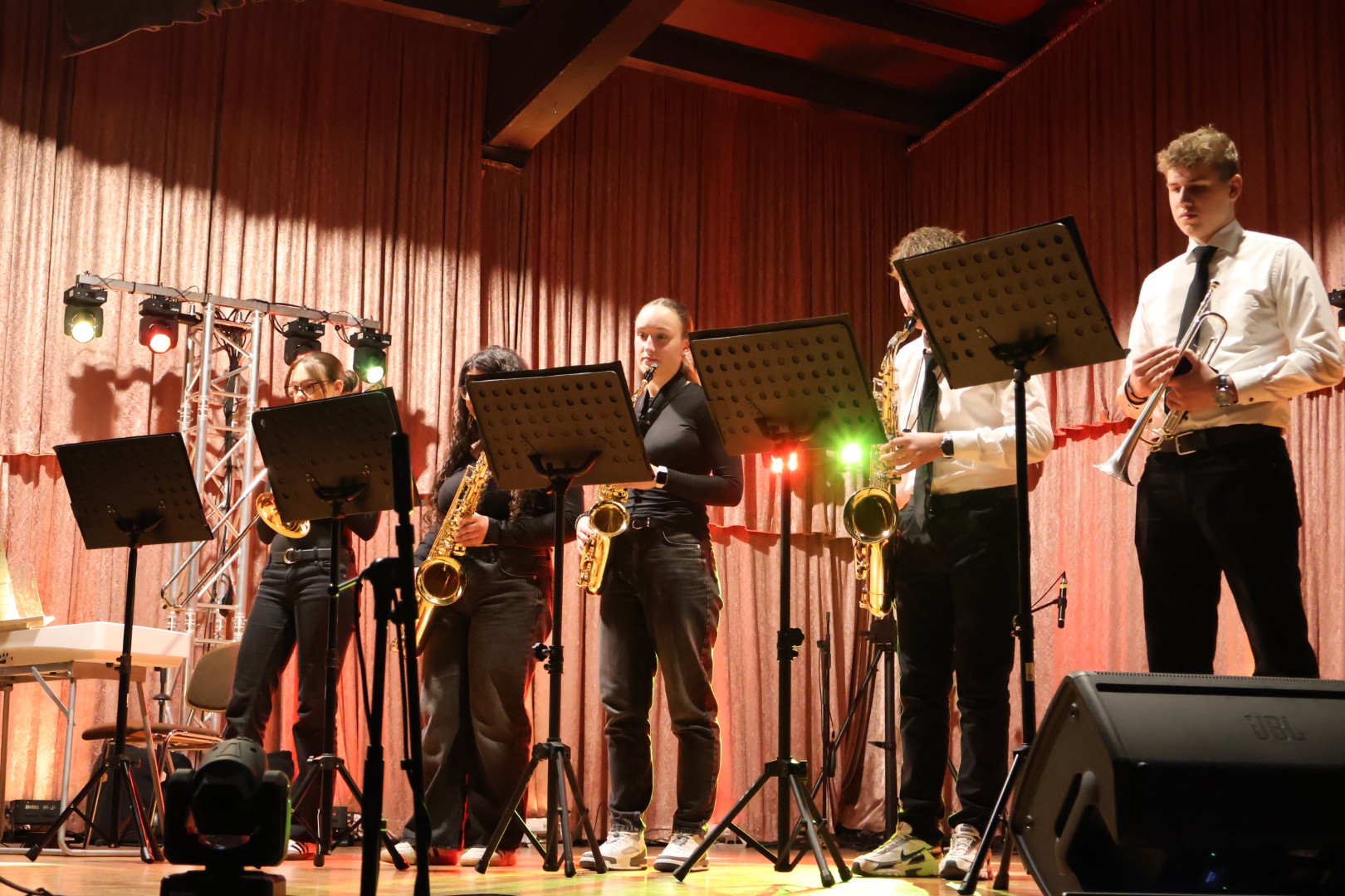 Im ersten Beitrag des Abends präsentierte sich die Theater-AG (R. Finke) mit ihrer gelungenen Inszenierung zu dem Gedicht „Dunkel war`s“. Getanzt wurde gleich zwei Mal: zunächst die 5F4 (J. Zaremba, A. Waldschmidt) mit ihrer schwungvollen Choreographie zu „Cotton Eye Joe“; am Ende des Abends beeindruckten Maleek, Liv, Hanna, Viktoria und Arges aus der Q1 mit ihrer Choreografie zu „Yeah“. Selbstverständlich wurde auch fleißig gesungen, so etwa die IKL aus der Grundschule mit den beiden Liedern „Ihr Blätter wollt ihr tanzen“ sowie „Heladiladilo“ (A. Ruppert-Damm). „Der Herbst steht auf der Leiter“ wurde von der Klasse 6F3 (N. Placzek-Ouaissa, C. Eidam-Blume) aufgeführt. Nicht fehlen durften natürlich die Beiträge der Show-AG (R. Erkel), die mit „Tell me that you love me“ und „Blinde Passagiere“ auch dieses Mal wieder für Gänsehautmomente sorgte. Instrumental imponierte erstmals Adm Mousa (Klasse 9R3) mit dem Klassiker „Fly me to the moon“ sowie dem arabischen Stück „Nasam alena alhawa“ auf seiner Violine. Und auch „The Bass Boys“, namentlich Simon Richter und Josua Smolny aus der Klasse 8G3, die mit „Only you“ und einem „Michael Jackson – Medley“ das Publikum begeistern konnten (T. Geitz). „The Six on Stage“ aus dem Jahrgang 10G präsentierten eindrucksvoll mit ihren Blasinstrumenten die Stücke „oj dorth“, „Wiegala“ und „Shir hawaalot“ (K. Guhl). Auf der Klarinette zeigte Davona Kinas (8G3) ihre Fingergeschicke bei dem zügigen und imposanten Stück „Clarinet Express“ (T. Meisner). Künstlerisch ging es auch auf sprachlicher Ebene zu: Der Leistungskurs Deutsch der Q1 (S. Kersten) las romantische Impressionen zu Gemälden von Caspar David Friedrich vor, die während des Unterrichts erstellt wurden. Informativ wurde es, als die deutsch-italienische Erasmusgruppe (W. Borschel, I. Younkin) dem Publikum die Partnerschule in Turin vorstellte. Seit bereits über drei Jahrzehnten findet der Austausch mit europäischen Ländern auf Schulebene statt und ermöglicht das Kennenlernen neuer Kulturen, das Vertiefen von Sprachkenntnissen und das Ermöglichen von internationalen Freundschaften und Kontakten. Davon zeugte auch der gemeinsame Auftritt, den die italienischen Schülerinnen und Schüler mit ihrer Nationalhymne beendete. Der gelungene Abend zeigte somit auch diesmal die kulturelle Vielfalt der Europaschule Gladenbach und ließ Schülerinnen und Schüler verschiedener Jahrgänge auf der Bühne glänzen.
